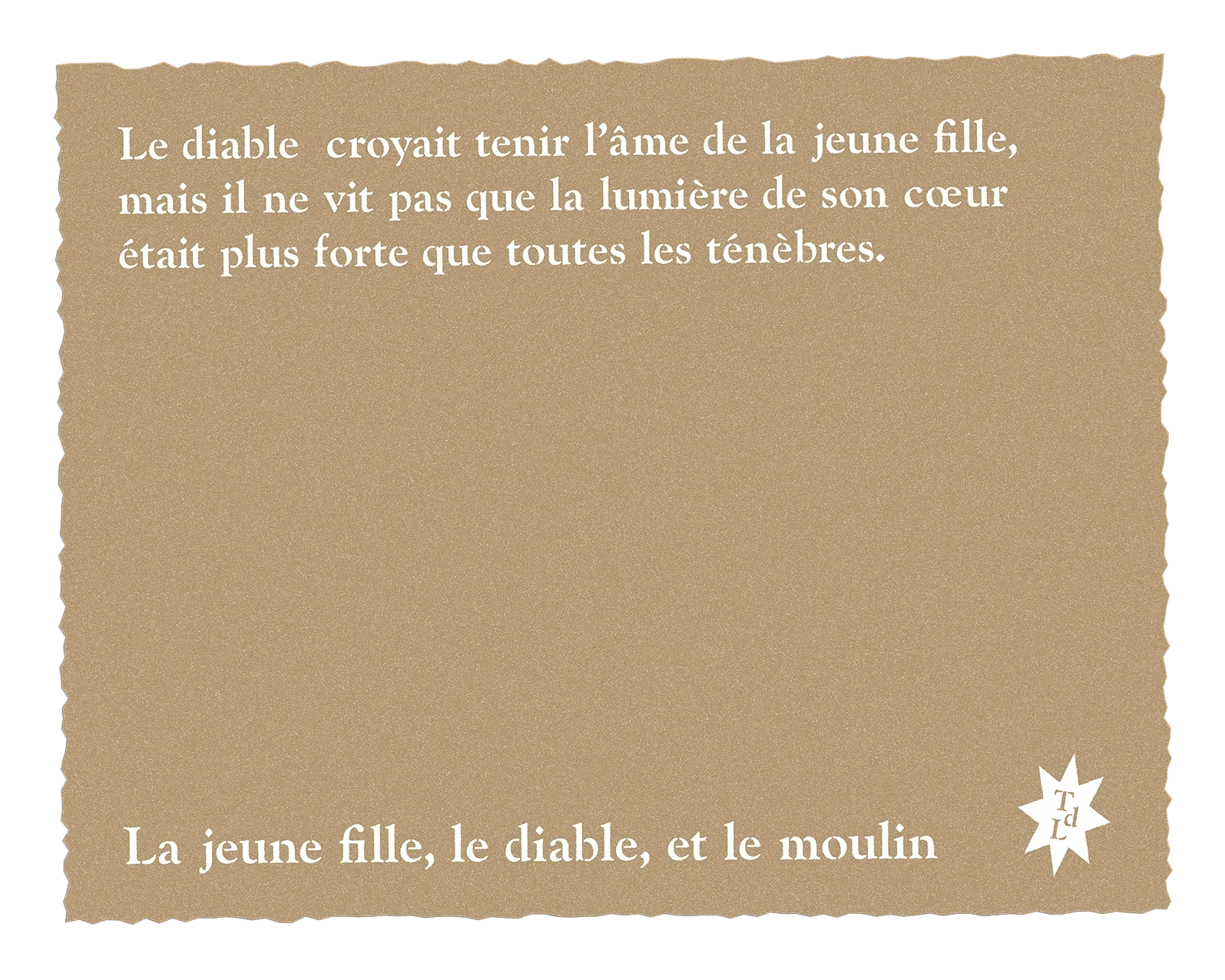 Les frères Jacob et Wilhelm Grimm ont collationné pendant des années les contes et légendes de l’Europe germanique et nordique, réunissant plusieurs dizaines d’histoires populaires de tradition orale, multipliant les versions, modifiant parfois le contenu pour que la morale bourgeoise soit sauve. Olivier Py y trouve matière à écrire des pièces qui permettent de faire découvrir les mystères et les conventions du « vrai » théâtre à de jeunes enfants en les prenant au sérieux. La Jeune Fille, le Diable et le Moulin est inspirée de La Jeune Fille sans mains, dont elle conserve la trame narrative. Une histoire de père naïf qui signe un pacte avec le diable sans se rendre compte qu’il sacrifie sa fille à qui il coupera les mains par peur d’une vengeance diabolique. Mais la jeune fille s’enfuit et commence alors un voyage semé d’embûches, de jardinier, de prince charmant, de sommeil et d’attente. Toutes ces épreuves, toutes ces rencontres, toutes ces étapes avant d’arriver au possible bonheur permettent de traverser nombre de questions que souvent les enfants se posent sans oser en parler : la mort, le diable, l’amour, la guerre, l’oubli, la relation aux parents… Parcours initiatique sans mièvrerie, La Jeune Fille, le Diable et le Moulin est aussi une pièce musicale qui préserve notre part d’enfance. Pièce de tréteaux, simple dans sa pauvreté de moyens, elle se déplace entre naïveté et gravité, gardant toujours une touche d’espérance pour la fin.
