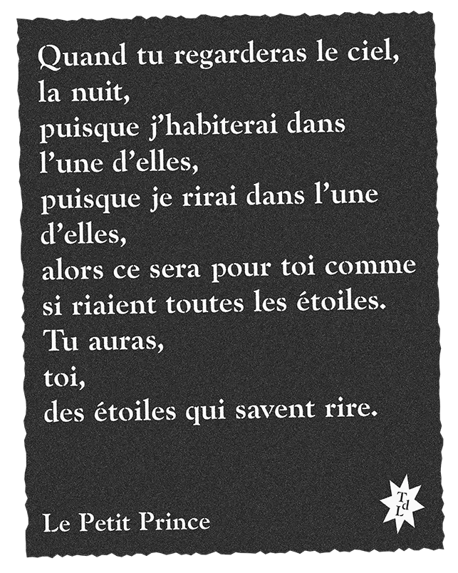 Un aviateur vient nous livrer son histoire : lors d’une panne dans le désert, en plein milieu du Sahara, alors qu’il se trouvait entre la vie et la mort, à mille kilomètres de tout, il a rencontré un enfant extraordinaire qui a bouleversé son existence : le Petit Prince. Il tente de retracer le plus fidèlement possible le portrait de son mystérieux ami qui nous embarque dans sa quête initiatique à travers le monde. La rencontre dure une semaine, chaque jour l’aviateur apprend de nouvelles choses sur l’enfant, ses origines, son voyage, ses rencontres et ses doutes. Puis, vient le moment des adieux et le petit être disparaît comme il est apparu, laissant un peu de sa présence dans les étoiles…