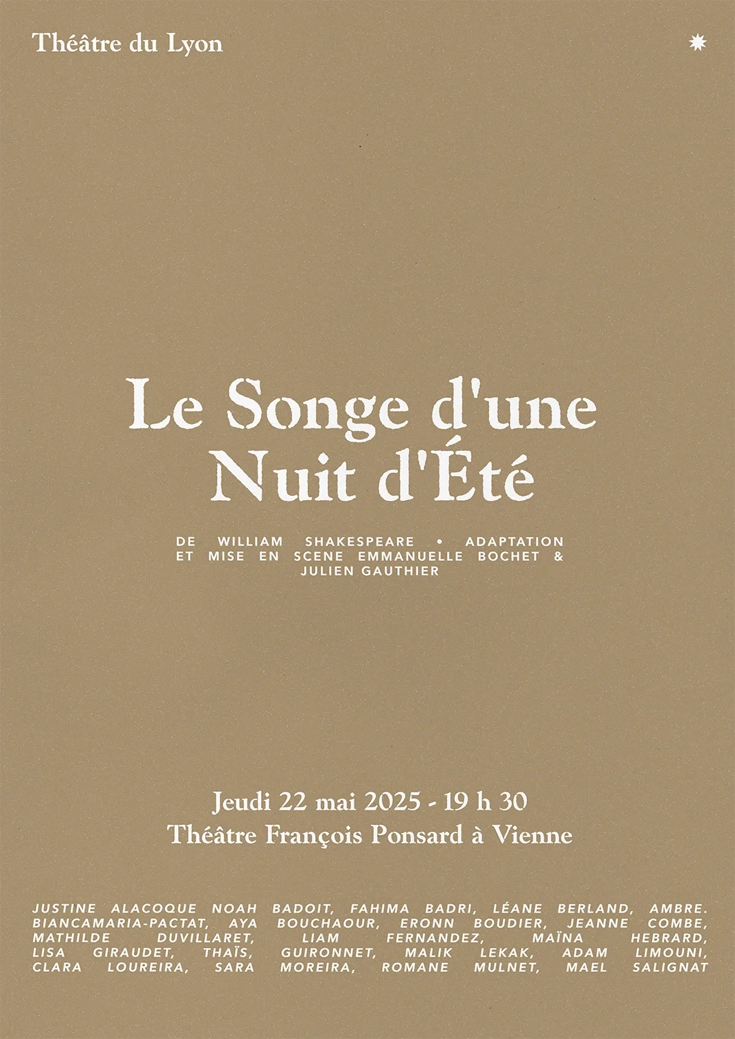 Dans Le Songe d’une nuit d’été, Shakespeare tisse une comédie féerique dans une forêt enchantée. Amours croisées, quiproquos loufoques et sortilèges malicieux mêlent mortels et fées. Puck, espiègle, sème le chaos ; Oberon et Titania dansent sous la lune. Ce rêve scintillant, vibrant d’humour, célèbre l’amour et la fantaisie dans un tourbillon de magie théâtrale, où chaque éclat de rire résonne comme un charme.